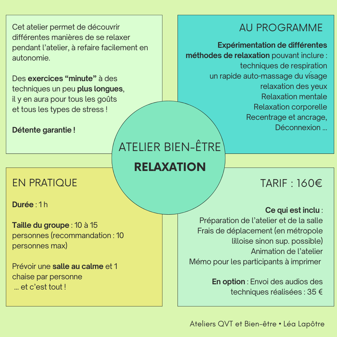 atelier relaxation Published 28 mai 2024 at 1080 × 1080 in Catalogue ateliers bien-être et QVT ← Previous Next →